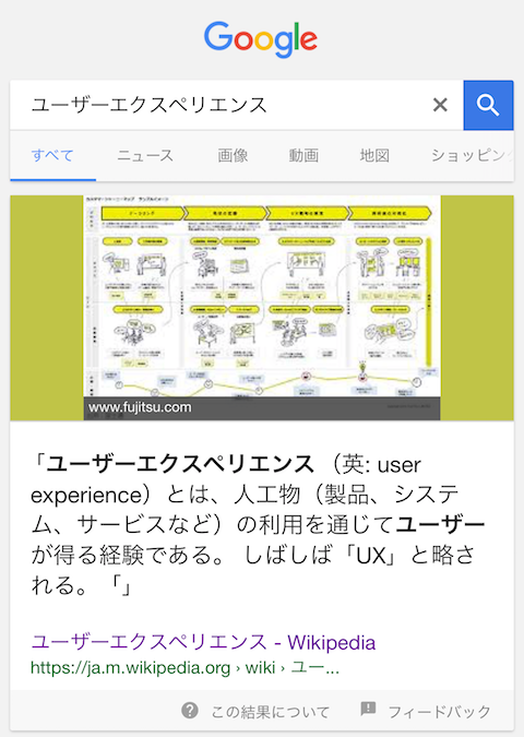 - ウィキペディアにおいて、冒頭文は最も重要で、慎重に書かれなければなりません。というのも、グーグル検索には「〇〇とは、〜〜である」のように検索クエリへの直接の回答を表示する「アンサーボックス」という機能があるのですが(みなさんも見覚えのあることかと思います)、アンサーボックスにはウィキペディアの冒頭文がしばしば用いられます。少なくとも「ユーザーエクスペリエンス」ではそうでした。ですから、ウィキペディアの冒頭文は簡潔な説明文でなければなりません。しかし、既存の冒頭文は、「ユーザーエクスペリエンスデザインは、ユーザーエクスペリエンスについてのエクスペリエンスデザインである」という悪文でした。何も言っておらず、読者の役に立ちません。